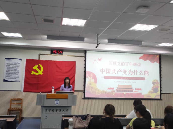 接着,她根据中共中央党史和文献研究院院长、研究员,中国中共党史学会会长曲青山的文章,从四个时间段,即开天辟地(1921-1949)、改天换地(1949-1978)、翻天覆地(1978-2012)、惊天动地(2012至今),带领大家简要回顾了中国共产党的百年历程。百年以来,为了国家事业,一代代领导人带领人民不断实现了救国、兴国、富国与强国大业,百年以来,为了国家事业,无数革命先烈不畏艰难险阻,顽强斗争才有了今日国家的强大和人民的幸福。紧接着,她从五个方面讲述了中国共产党为什么能从小到大、由弱变强、从红船到巨轮。那是因为中国共产党有科学的理论指导;始终坚持思想建党、理论强党;坚定的理想信念,并愿意为之奋斗终身;强大的组织优势,从党中央到基层党组织,中国共产党形成了一个上下贯通的统一整体;坚实的群众基础,始终坚持人民利益至上;彻底的自我革命,勇于自我革命。