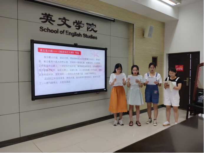 其次,廉文军同大家分享了名叫《中国智慧》的红色书籍,主要从对外开放中如何从参与者到领导者、如何从大规模减贫到精准脱贫、生态文明等方面对书中内容做了总结和分析。她还深入分析到,《中国智慧》这本书为促进经济全球化健康发展和解决人类问题贡献了中国智慧和中国方案,其中也蕴含着我国丰富的智慧硕果和文化精神。随后,各党小组依次朗诵了《飞越大渡河》、《大写的中国》、《南京长江大桥》、《可爱的中国》等红色经典作品,在他们铿锵有力且激情高昂的声音下,是浓烈的青春朝气和强烈的民族自豪感。