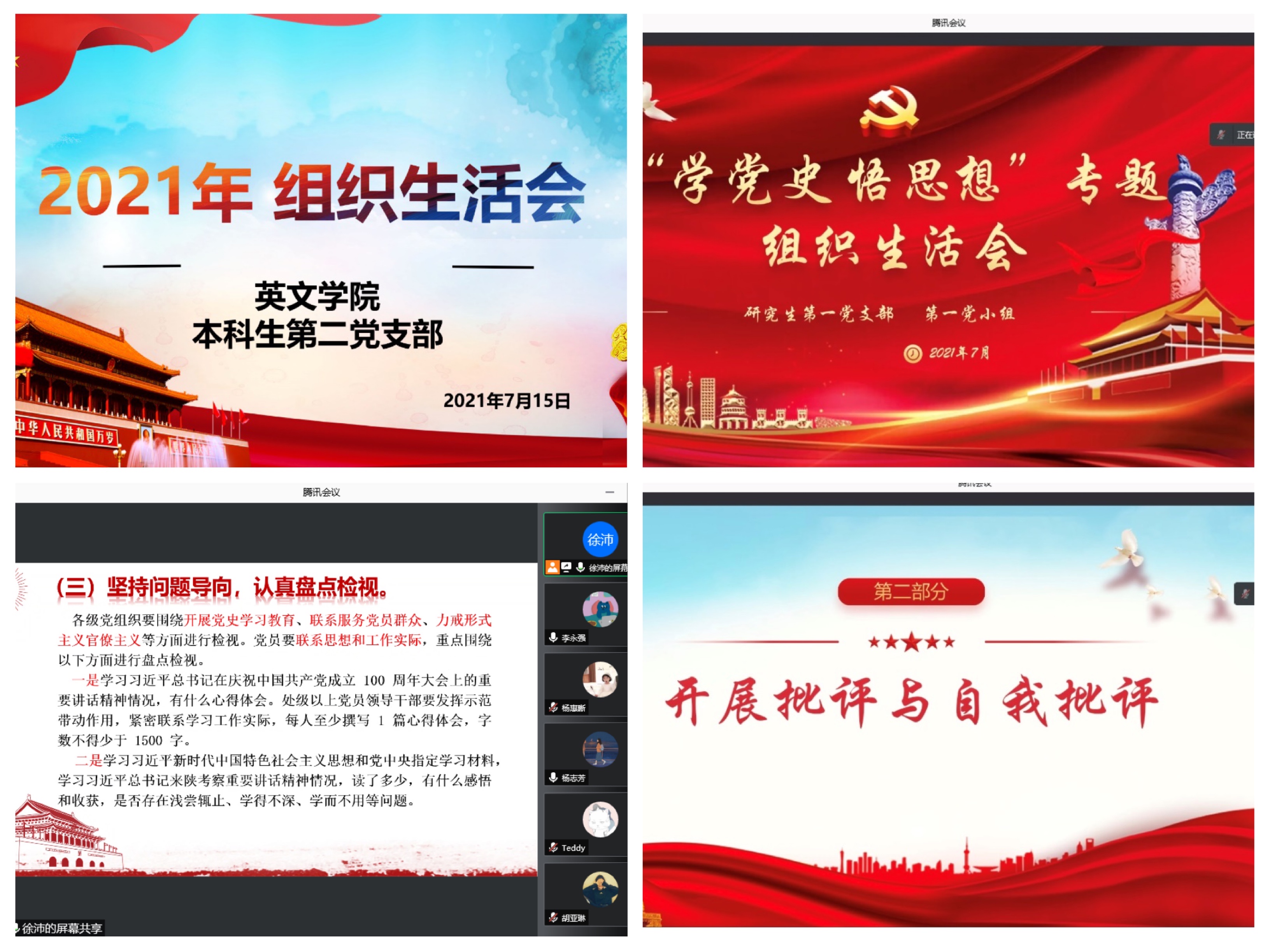7月14日至7月16日,我院师生党员共计17个党支部通过线上与线下相结合的方式分别召开了党史学习教育专题组织生活会。学院党委书记单升军、院长南健翀、党委副书记马文静、副院长裴等华以普通党员的身份分别参加了视听说、基础英语、翻译、专业英语等党支部专题组织生活会。
